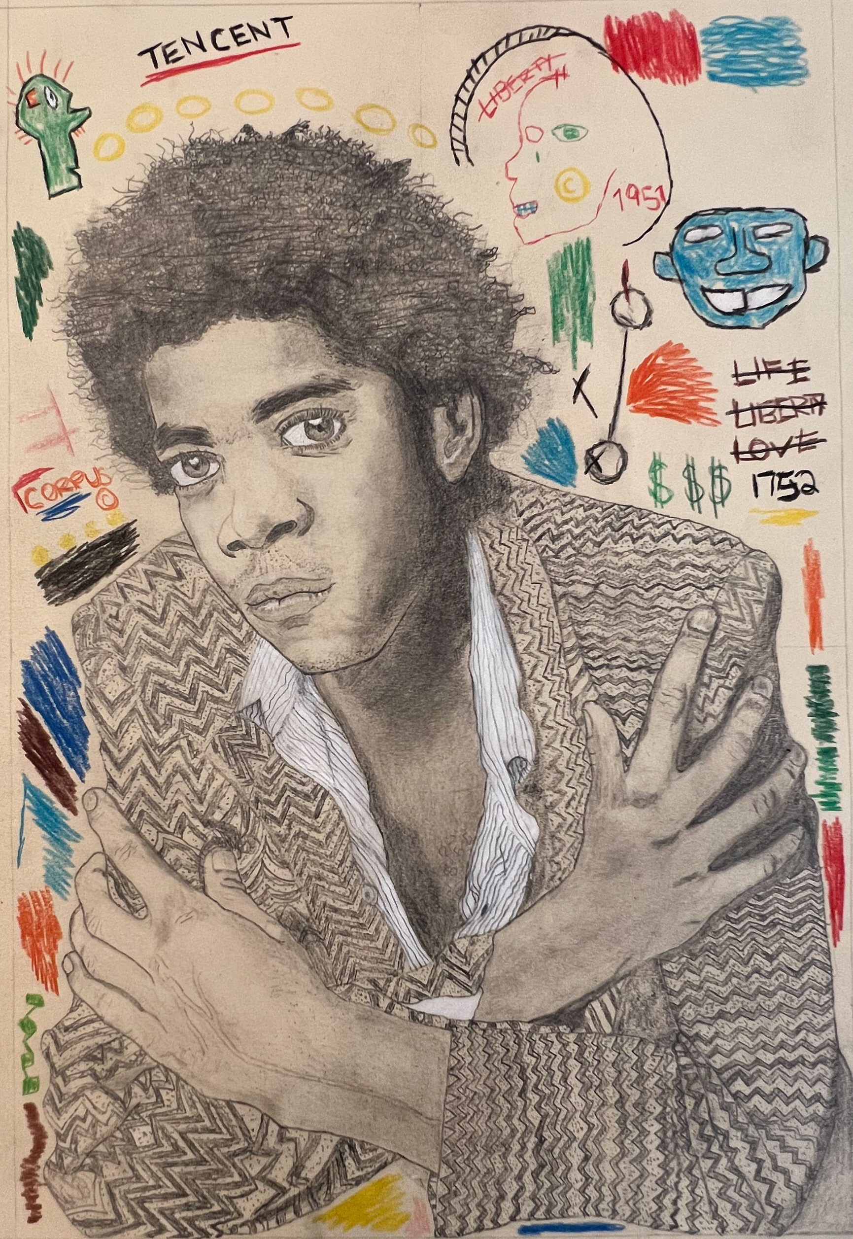JEAN-MICHEL BASQUIAT PORTRAIT GRAPHITE AND COLORED PENCIL ON PAPER